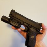 Everything listed above performed as you would expect. The gun received 4 drops of lube total, 1 per rail after day 1. I had a single user induced double feed during a press check with the EDC X9. Everyone that asked was surprised at the lack of carbon build up on the fiber optic front sight. While some sights had a slight advantage over the fiber optic, I was in no way hindered by it. In particular, Dave’s own Ameri-glo photo-luminescing/ tritium combo front sight impressed me greatly; but he quickly points out that the luminescent sight only serves as a reference point. They aren’t always used for true aimed fire. With the taught techniques I was able to put all of my shots from 3-15 yds in the thoracic cavity target in almost complete darkness (a handful of expired chem- lights for safely marking the firing line). The green fiber optic was lost in smoke with some techniques, but quickly reappeared with a shift of the handheld light. The gas pedal switch on the EDCL2-T was problematic with about half of the mated techniques. The switch on the Tactician was significantly better in that regard. The gun mounted light really does have some significant advantages, but it is not without its own problems. I also played with a 6p, with and without the Thyrm switchback and various combat rings.